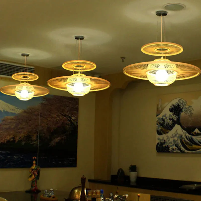 1 Kopf Restaurant Hängelampe Asiatische Beige Deckenpendelleuchte mit rundem Bambusschirm