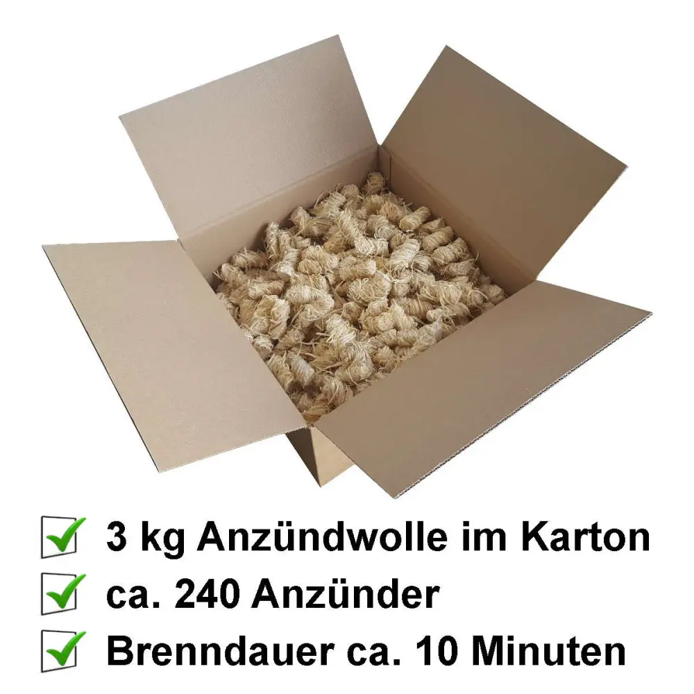 Ökologische Anzündwolle aus Naturholz und pflanzlichem Wachs zum sicheren, geruchsarmen und sauberen Anzünden. Geeignet als Grillanzünder, Kaminanzünder, Ofenanzünder und für offene Feuer. FSC®-zertifiziertes Produkt aus 100 % nachwachsenden Rohstoffen. Produkt entspricht DIN EN 1860-3. Brenndauer ca. 10 Minuten. Im Wellpappkarton mit 3 kg Anzündern. Ca. 240 Anzünder pro Karton. Da es sich um ein Naturprodukt handelt, kann die Anzahl der Anzünder auf 3 kg variieren.