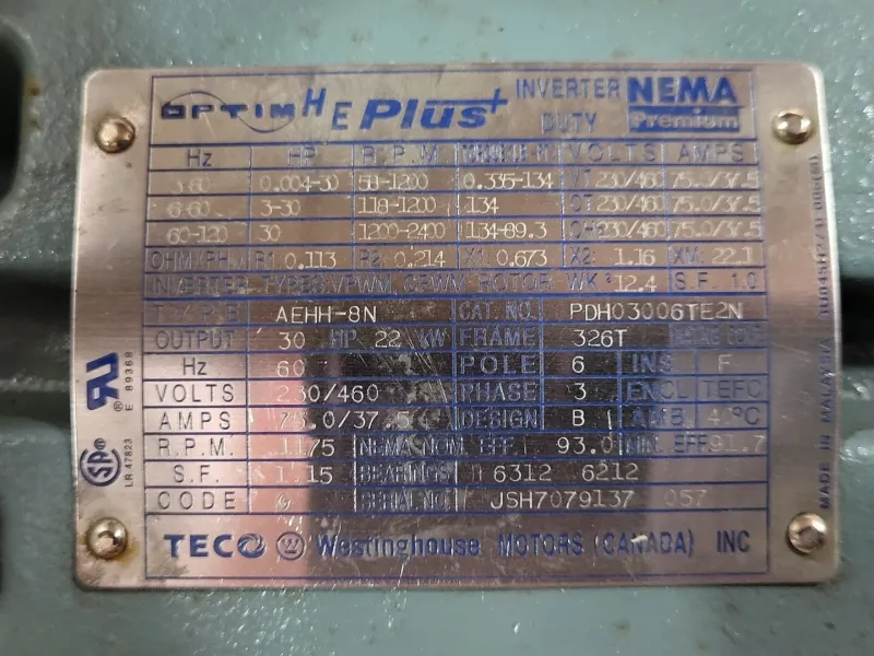 Model: OPTIM HE PLUS Poles: 6 Frequency: 60 Hz Ampere: 75.0 / 37.5 amps Enclosure: TEFC |