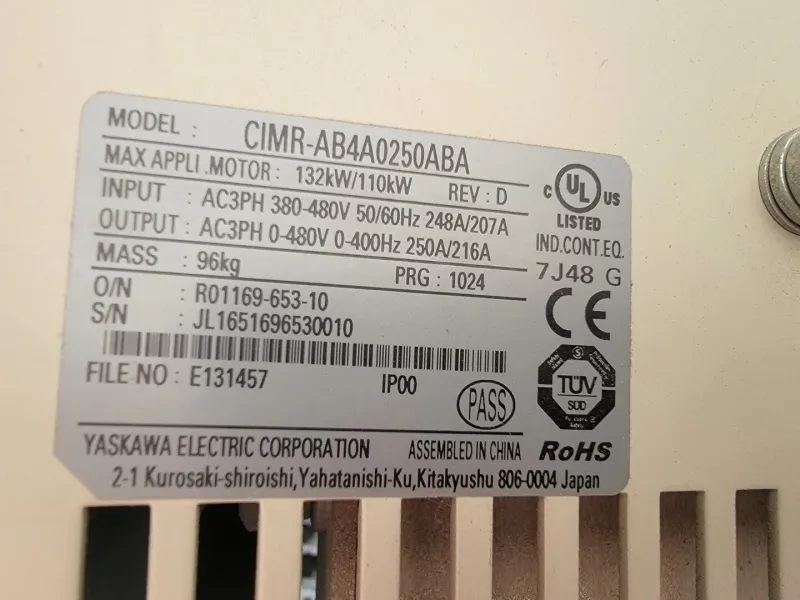 Max Application Motor: 132kW/110kW Input: 3ph, 380-480V 50/60Hz, 248A/207A Output: 3ph, 0-480V 0-400Hz, 250A/216A |