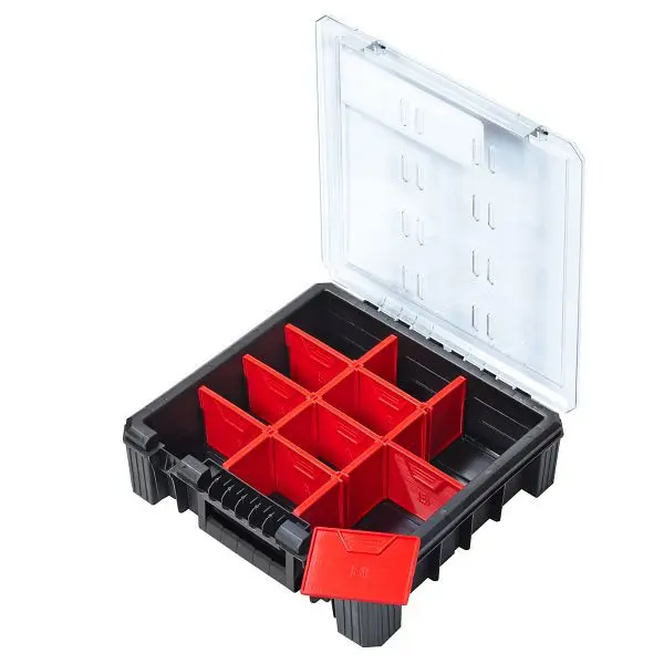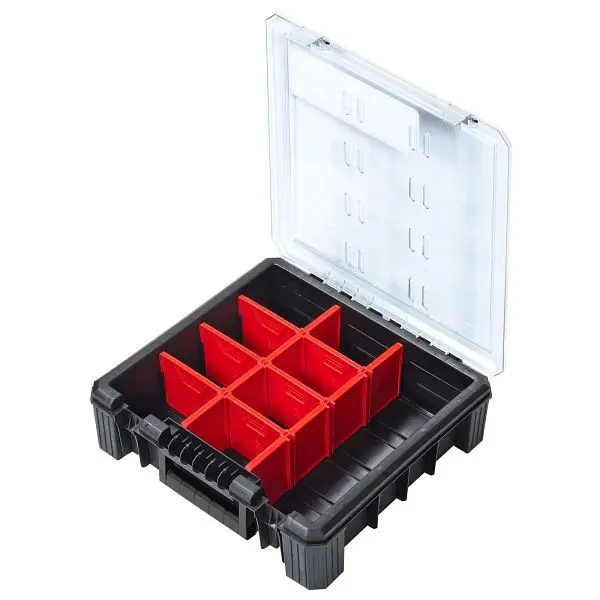 ADB Kleinteilemagazin Produktlinieskasten HD 400 Flex, 15505, 4050049155052Der ADB Kleinteilemagazin Produktlinieskasten bietet mit seinen 12 Fächern eine übersichtliche Lagerungsmöglichkeit von Kleinteilen (wie z.B. Schrauben, Nägel, Muttern, Dübeln, usw.).Dank der herausnehmbaren Trennwände, können Sie Ihre Kleinteile ganz individuell platzieren oder schaffen sogar Platz für Werkzeug.Durch den Polycarbonat-Deckel, Anti-Schock-Ecken und ein verstärktes Gehäuse ist der Produktlinieskasten ein besonders stabiler Begleiter auch unter den extremsten Voraussetzungen. Die hochwertigen Alukleinformatum-Verschlüsse runden dabei das Profil ab und verhindern ein ungewolltes öffnen des Organizers.Technische Daten: