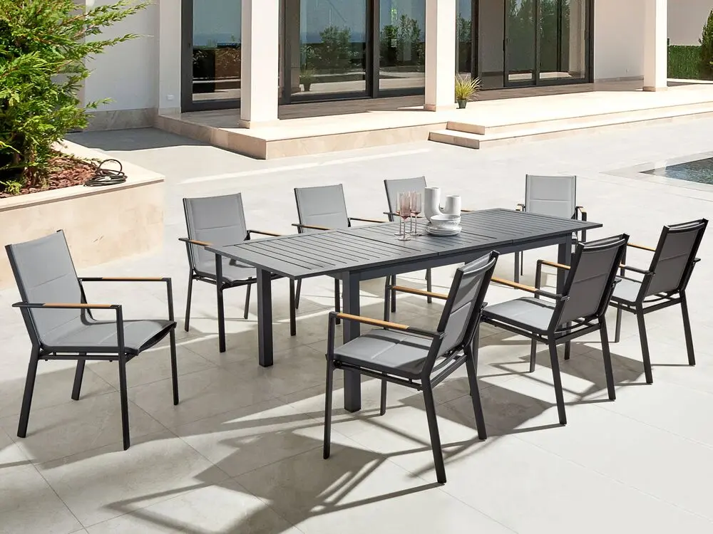Moderner Aluminium-Ausziehtisch für den Außenbereich Dieser großzügige Esstisch ist die perfekte Lösung für alle, die nicht nur alleine, sondern auch mit mehreren Gästen gerne die Zeit im Freien verbringen. Der integrierte Auszugsmechanismus erlaubt Ihnen, seine Tischplatte zu verlängern. So erhalten Sie nicht nur noch mehr