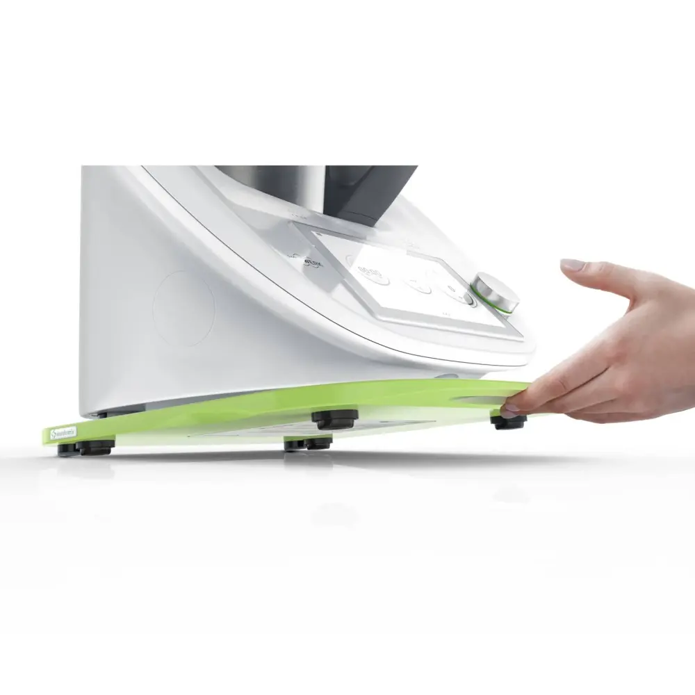 The new KitchenSlider® M V2 Plus (with 4 elastisch stoppers) made of high-quality unifarben surface material HI-MACS® is a practical kitchen accessory that allows the Thermomix® to be moved safely and conveniently on the worktop to wherever it is needed. The sliding board also protects the sensitive scales located in the feet of the appliance.