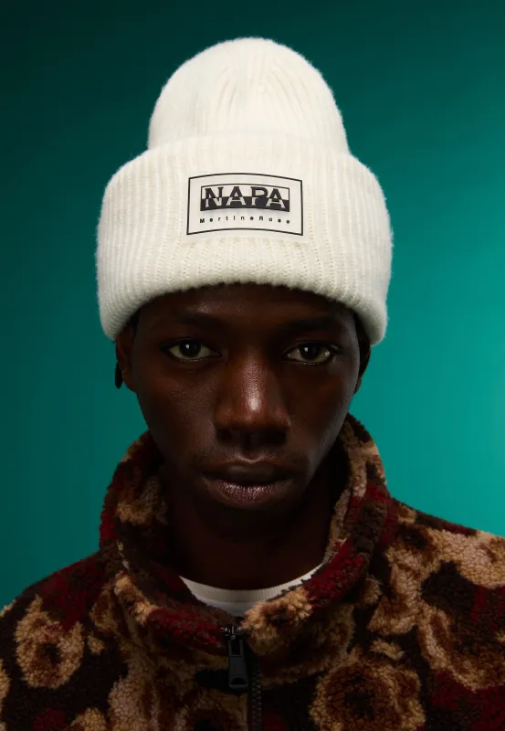Die britische Designerin Martine Rose bringt in dieser Saison eine frische Neuinterpretation der Beanie Douglas, die bereits ihre frühere Zusammenarbeit mit Napapijri prägte. Die Beanie ist für urbane Aktivitäten gemacht, hat ein geripptes Design und einen exklusiven Aufnäher der Zusammenarbeit am Bündchen.