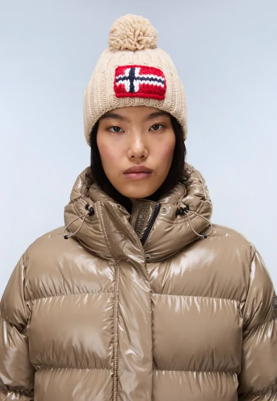Die Beanie Semiury besteht aus einer Wollmischung mit Rippstrick und überdauert daher besonders warm. Das ikonische norwegische Flaggenlogo auf der Vorderseite macht die Pudelmütze zu einem Hingucker.
