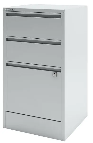 Bisley Home Filer, 2 Universal-, 1 HR-Schublade, lichtgrau, HF3645, 5020073762419Der Bisley Home Filer ist das Einstiegsmodell für den Büroalltag. 2 Universalschubladen und 1 Hängeregistraturschublade auf kugelgelagerten Laufschienen und mit 75% Auszug bieten Platz für Ihre Unterlagen im Format DIN A4. Das Schloss in der Hängeregistraturschublade, dass diese und die mittlere Schublade verschließt, sorgt für Schutz. Der Bisley Home Filer ist mit durchgehender Handhabungleiste ausgestattet. Abmessungen: H 672 x B 413 x T 400 mm. Farbe lichtgrau