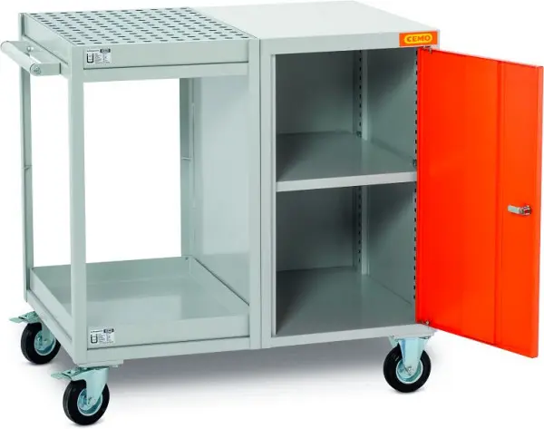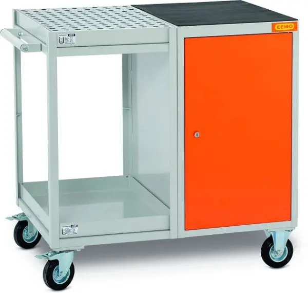 Cemo Werkstattwagen mit Wannen und Schrank, 11584, 4052886444771Mobiler Werkstattwagen in strapazierfähigem Gestaltung für den Verwendung im Arbeits- und Lagerbereich. Ideal auch als Station zum Dosieren von Flüssigkeiten und gewissen Bereitstellen von Gefahrstoffen. Es sind 3 Varianten erhältlich