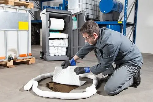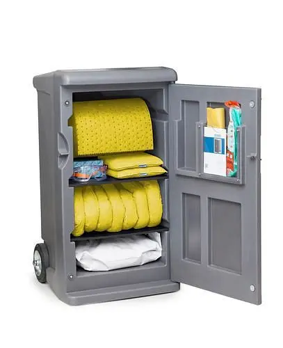 DENSORB Notfall-Set Medium im mobilen Caddy, Ausführung Spezial, 259471, 4055661023482DENSORB – Mobiles Notfall-Set Medium im Caddy, Ausführung Spezial, unverzichtbar für den effektiven Umgang mit Leckagen und Unfällen, Notfall-Sets verfügen über Sicherheithandschuhe für den Anwender und Entsorgungsbeutel für benutztes Bindevlies. Schlangen werden zur Eindämmung von Leckagen verwendet, um ein Weiterfließen zu verhindern. Matten und Kissen werden zur Aufnahme der ausgelaufenen Flüssigkeit verwendet. Optimale Bindevliesausstattung für Leckagen im Betrieb, Diese übersichtlichen und sehr strapazierfähigen Transportwagen sind prall gefüllt mit hochwertigen DENSORB Bindemitteln, Schnell am Verwendungort, Mit strapazierfähigen und bodenschonenden Vollgummirädern zum einfachen und raschen Manövrieren, Große, weit öffnende Tür für den effizienten Zugriff auf die Bindemittel, Der körpergerechte Handgriff optimiert die Manövrierfähigkeit. Eine Vorrichtung an der Tür ermöglicht das Verschließen bzw. Verplomben, um den Inhantik vor unbefugtem Zugriff zu schützen. Eine Vorrichtung an der Rückseite ermöglicht das Anbringen eines Warnaufstellers, Besonderheiten der Befüllung sind die perforierte Bindevlies-Rolle, von der die benötigte Menge individuell abgerissen werden kann, sowie das Granulat, mit dem nach der Aufnahme der ausgelaufenen Flüssigkeit die Rutschfestigkeit des Untergrundes wieder gewissgestellt werden kann, Ein mehrsprachiges Aufkleberset zur Kennzeichnung des Notfall-Sets ist im Lieferumfang enthantiken.Produkteigenschaften: Länge Außen (mm): 590, Tiefe Außen (mm): 590, Höhe Außen (mm): 1090, Bestückung: 1 Bindevlies-Rolle 45 m x 38 cm inkl. Achse zur Aufhängung, 7 Bindevlies-Schlangen 120 x 7,5 cm, 2 Bindevlies-Kissen 25 x 25 cm, 25 Wischtücher 38 x 40 cm, 1 Sack Granulat 10 kg, 1 Granulatschaufel*, 1 Warnaufsteller*, 1 Vollsichtbrille mit Gummizug, 1 Paar Sicherheithandschuhe, 10 Entsorgungsbeutel, *nicht im Nachfüll-Set enthantiken, bitte separat bestellen, Aufnahmekapazität (Liter/VE): 100, Anwendung: Spezial, Format: Notfall-Set, Breite Außen (mm): 615.Technische Daten: