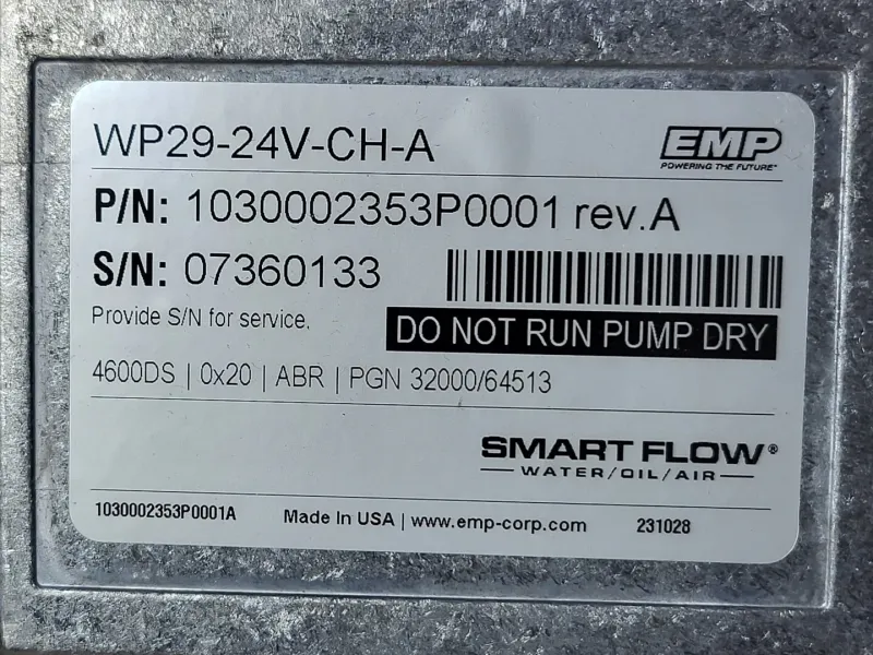 P/N: 1030002353P0001 Rev A Model: Water Pump 29 Voltage: 24V Shaft: Carbon Orientation: Horizontal I/O: Address Input |