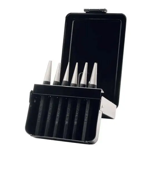 ELORA Durchtreiber-Satz in einem Plastikständer, 6-teilig, 264KS, 0264500607000, 40229890435846-teilig, in Kunststoffhantiker, komplett durchgehärtet und angelassen, Schlagköpfe induktiv angelassen, Arbeitsseite geschliffen und geölt, Schaft schwarz lackiert, ELORA-Chrom-Molybdän-Vanadium 45CrMoV7 / 1.2328, nach DIN 6458Technische Daten: