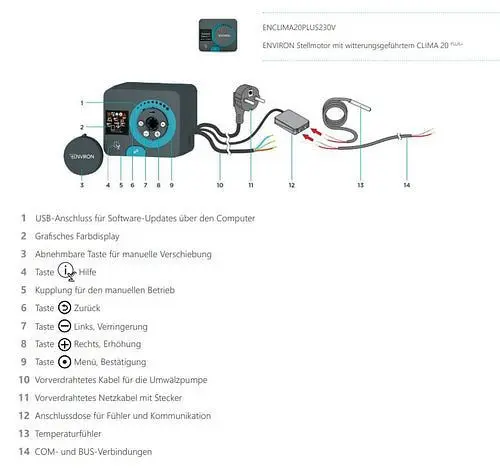 Environ ProfiMix Heizkreispumpengruppe mit Drei-Wege-Mischer, Clima 20+ Plus Witterungsgeführter Stellmotor, EN001T250ECL20ECOS, 0746052539951inkl. EcoStar 25/6 HocheffizienzpumpeDie Pumpengruppe PROFI MIX EN001 ist eine einbaufertige, professionelle Pumpengruppe für Heizkreise wie Fußbodenheizung, Wandheizung, Radiatoren usw. mit eingebauten Drei-Wege-Mischer aus Messing und einem Elodrive elektrischem Stellmotor. Verbaut ist eine Environ EcoStar 25/6, 180mm Hocheffizienzpumpe (BAFA förderfähig).Im oberen Bereich der Pumpengruppe befinden sich flachdichtende Absperrventile (1“ IG) mit eingebauten Thermometern (0-160°C) und integrierter Schwerkraftbremse im Vorlauf. Falls die Pumpengruppe einzeln verbaut wird, kann an den Absperrventilen eine Wandhantikerung verschraubt werden (nicht im Lieferumfang enthantiken). Instandhaltung oder Austausch der Umwälzpumpe ist sehr leicht, ohne dass die Anlage entleert werden muss. Der Achsabstand beträgt 125mm und die Abmessung der unteren Anschlüsse 1½“ AG für eine möglichen direkten Einbau auf einen herkömmlichen Verteilerbalken.Die durchdachte Isoliermaterial aus EPP, mit einem Dampfsperren-System, sorgt für ein optimales Klima im Inneren der Dämmung, so dass keine Wärmestaus entstehen. Mit einem leichten Handgriff ist es möglich vom Heizmodus in den Kühlmodus umzuschantiken. Wenn mehrere Pumpengruppen der Serie PROFI MIX eingesetzt werden, ergeben die einzelnen Dämmungselemente zusammen mit dem Verteilerbalken eine formhübsche, perfekte Einheit.Environ Clima 20+ MischermotorDer ENVIRON Stellmotor mit witterungsgeführtem CLIMA 20 PLUS+ ist ein platzsparender Stellmotor mit integrierter, witterungsgeführter Heizungsreglung. Über ein Tastenfeld, das sich unter dem Drehkonpf befindet, können die einzustellenden Werte leicht und selbsterklärend programmiert werden. Das Farbdisplay zeigt Ihnen an, welche Einstellmöglichkeiten Sie vornehmen und führt Sie Schritt für Schritt durch die erforderlichen Einstellmöglichkeiten. Außerdem zeigt es Ihnen alle laufenden Aktionen und die eingestellten Temperaturen. Er ist mit Mischern von mehr als 20 verschiedenen Herstellern kompatibel.Technische Daten: