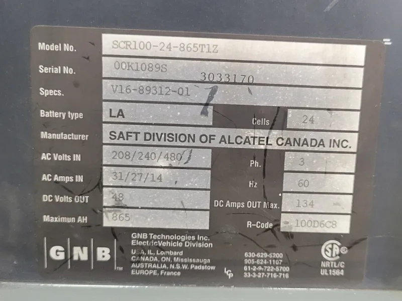 Battery Type: LA No. Cells: 24 Amp Hours: 865 AH Voltage: 208/240/480V |