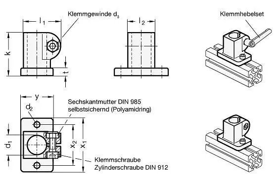 Ganter Fuß-Klemmverbinder, Alukleinformatum (GN 162.3-B12-2-BL), VE: 10 Stück, 162.3-B12-2-BL, 4045525800106Die Klemmbohrung der Fuß-Klemmverbinder GN 162.3 ist mechanisch bearbeitet und ausgelegt für Bauweisesrohre GN 990 bzw. DIN 2391, DIN 2395 und DIN 2462.Fuß-Klemmverbinder GN 162.3 sind auch zum Anbau an Profilsysteme geeignet.Die Klemmschraube ist in der Standardausführung eine Zylinderschraube mit Innensechskant DIN 912. Sie kann durch ein Klemmhebelset GN 911 ersetzt werden (Bestellbezeichnung siehe Maßtabelle).Technische Daten:
