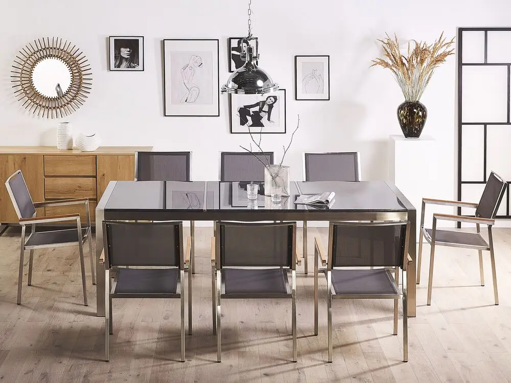 Das exquisite Tischset aus wertvollem Edelstahl und Granit ist ein komplett besonderes Modell in unserer Produktepallette. Die Materialien der Tischplatte bilden ein Zusammenspiel, welches an Robustheit und Eleganz kaum zu übertreffen ist. Der glänzende Rahmen aus gebürstetem Edelstahl ist äußerst zuverlässig und wasserfest. Die graue polierte Granitplatte ist extrem witterungsbeständig und perfekt verarbeitet, so bildet sie eine unverwüstliche Tischoberfläche. Die acht designer Stühle mit dem standfesten Gestell und erstklassiger UV- beständiger Textilsitzfläche in Grau harmonieren perfekt mit dem robusten Tisch.