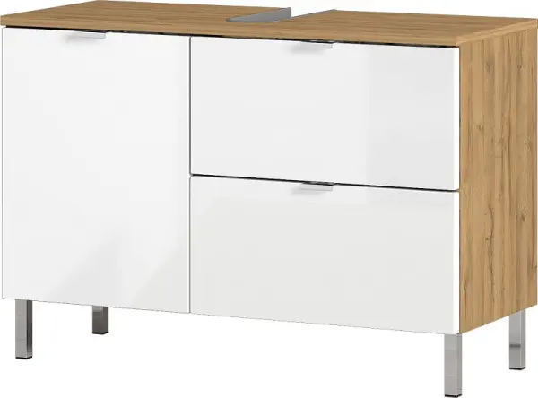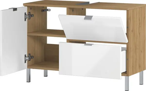 GERMANIA GW-MAURESA WB-Unterschrank 8530, Grandson-Eiche-Nachbildung/Weiß, 8530-552, 4005949853010Germania Waschbecken-Unterschrank 8530 GW-Mauresa, in verschiedenen Dekoren, 80 x 56 x 34 cm (BxHxT)Um das Badezimmer oder Gäste-WC in eine wahre Wellness-Oase zu verwandeln, eignen sich die Möbel aus dem Programm GW-Mauresa von Germania perfekt. Durch vier verschiedene Farbvarianten passt sich dieses Bad-Programm jedem Ausstattungsstil an. Gemütlich und nett überzeugt die Variante in Grandson-Eiche-Nachbildung mit Hochglanzfronten in Weiß. Ein Hingucker ist die Ausführung in Graphit mit Fronten in Grandson-Eiche-Nachbildung und besonders innovativ kommen die Varianten in Graphit mit Hochglanzfronten in Weiß oder komplett in Weiß daher. Die Fronten der Möbel aus dem Programm sind aus MDF gefertigt und mit Kantengriffen versehen. Handhabunge und Füße der Standmodelle sind aus Metall gefertigt und in der Farbe Chrom veredelt.Der hier gezeigte Waschbeckenunterschrank 8530 ist mit einer Schublade, einer Klappe und einer Tür ausgestattet. Alle Scharniere des Möbels sind gedämpft und lassen sich dadurch sanft öffnen und schließen. Mit seiner Breite von 80 cm, der Höhe von 56 cm und einer Tiefe von 34 cm findet der Schrank spielend Platz unter jedem Waschbecken. Die Aussparung für den Siphon lässt diesen geschickt im Innenraum des Möbels verschwinden. Auf einem verstellbaren Einlegeboden hinter der Tür finden Waschutensilien und Handtücher Platz.Sollten sie weniger Raum zur Verfügung haben ist ein zweiter Waschbeckenunterschrank (Artikel-Nr. 8529) aus dem Programm GW-Mauresa erhältlich. Er passt mit einer Breite von nur 60 Zentimetern auch in das winzigste Bad.Alle Möbel aus dem Programm sind mit einer Melaminharzbeschichtung veredelt, die Feuchtigkeit leicht abperlen lässt. Hochwertige ABS-Kanten machen die die Badezimmerschränke besonders stoß- und schlagfest.Für eine stimmige Ausstattungssituation im Bad entdecken Sie auch alle weiteren Möbel aus dem Programm GW-Mauresa von Germania: Neben den beiden Waschbecken-Unterschränken sind eine Kommode (Artikel-Nr. 8531), ein Schrank (Artikel-Nr. 8532) und ein angepasster Spiegel (1429) erhältlich.Alle Möbel der Firma Germania werden in Deutschland entwickelt und hergestellt. Sie werden inkl. Wandbefestigung geliefert (lediglich Schrauben und Dübel müssen entsprechend der Wandbeschaffenheit separat erworben und verwendet werden).Ihre Vorteile: