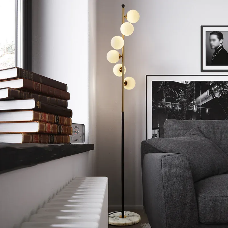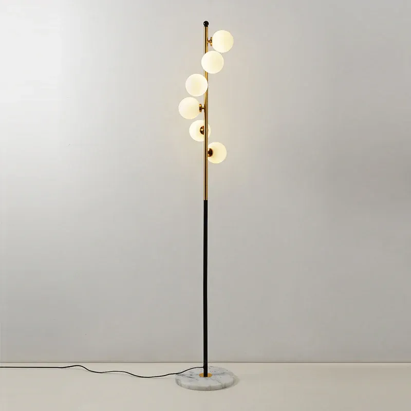 Gold- und schwarze Kugel-Bodenbeleuchtung. Minimalistische 6-flammige Stehlampe aus cremefarbenem Glas