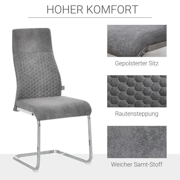 HOMCOM Esszimmerstühle 4er Set Küchenstuhl mit Rückenlehne Sitzfläche für Küche Wohnzimmer Velvet-Touch Stahl Grau 45 x 61 x 98 cm, 835-407, 4251774984812Diese innovativen Esszimmerstühle von HOMCOM passen zu vielen Ausstattungsstilen. Das gebogene Gestell aus Metall verleiht diesen Stühlen ein einzigartiges und innovatives Aussehen. Die stabile Bauweise aus Metall verleiht diesen Stühlen einen gewissen Stand. Fußpads aus Kunststoff schützen ihren Boden vor unerwünschten Kratzern. Ob Wohnzimmer, Esszimmer oder Küche – diese Esszimmerstühle sehen leicht überall gut aus.