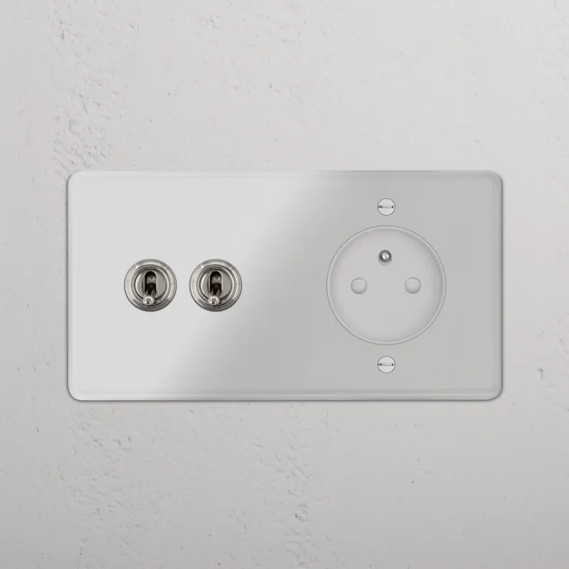 Schlank und schnörkellos: Das ist unser Schalter mit zwei Kipphebeln und einem französischen Modul in Zweifachrahmen. Macht sich neben dem Bett oder in der Küche ganz besonders gut.