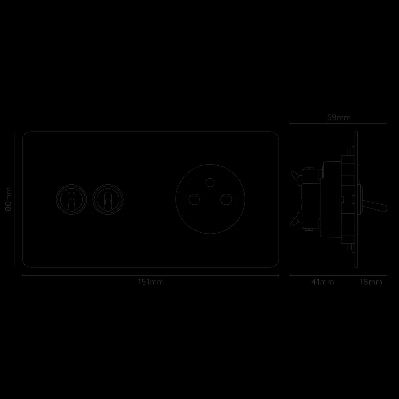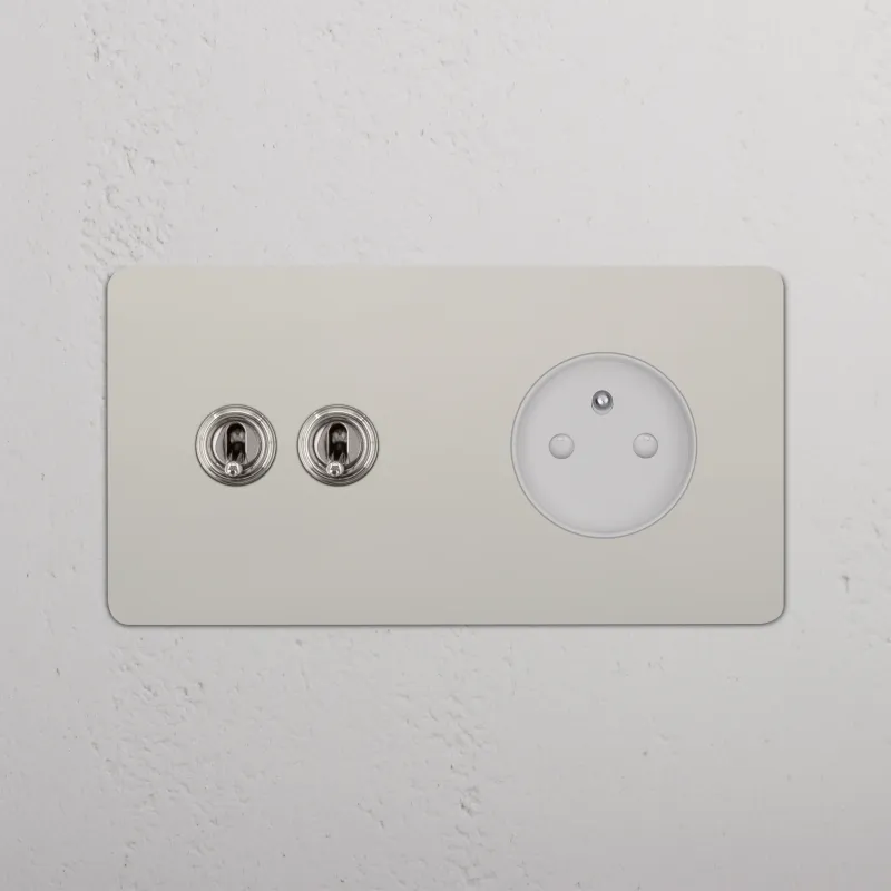 Diese Doppelsteckdose kombiniert zwei Wechselkipphebelschalter und eine französische/belgische Steckdose in einem Rahmen.