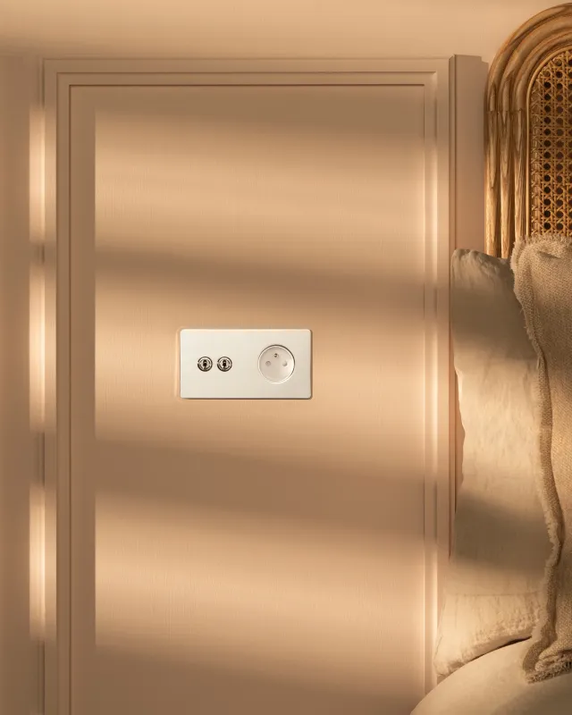 Der außerordentlich flache Rahmen, der sich bündig an die Wand schmiegt, macht diesen Schalter besonders diskret.