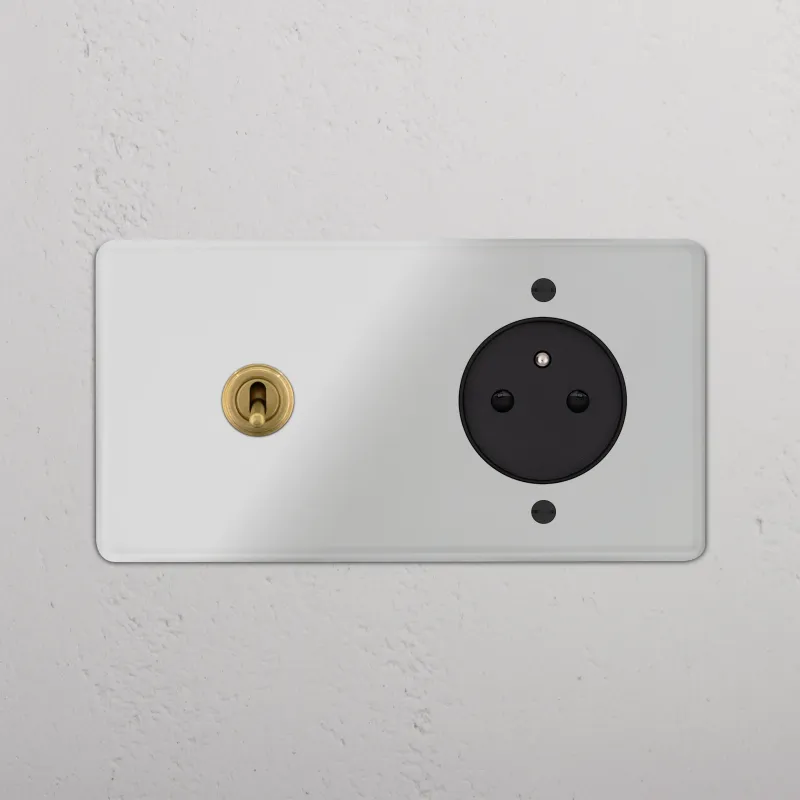 Dieser Doppelrahmen kombiniert einen Wechselkipphebelschalter und eine Typ-E-Steckdose.
