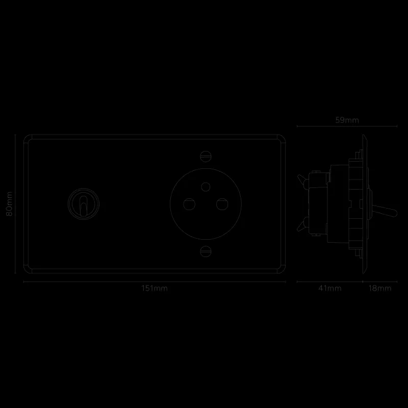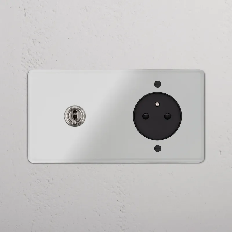 Schlank und schnörkellos: Das ist unser Schalter mit Kipphebel und französischer Steckdose in Zweifachrahmen. Macht sich neben dem Bett oder in der Küche ganz einzigartig gut.