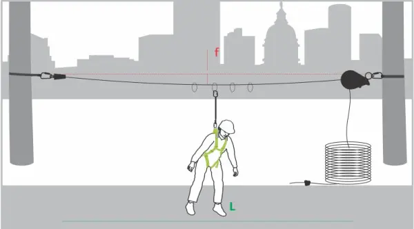 - Achtung! Bei Anbringen des Sicherungsseils ist unbedingt dessen Durchhang(f) zu beachten, welcher zur Sturzhöhe der verwendeten Absturzgewissung hinzuzuzählen ist. f = 4,83 m (für L=25m)