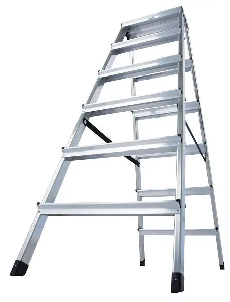 Info: Beidseitig begehbare Stehleitern dürfen nur bis zur dritten Sprosse/Stufe von oben bestiegen werden! Gemäß EN 131–Teil 3