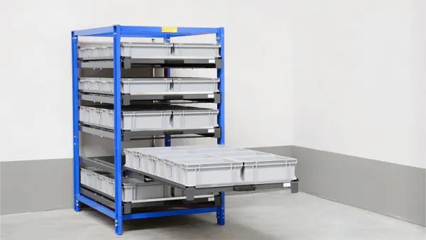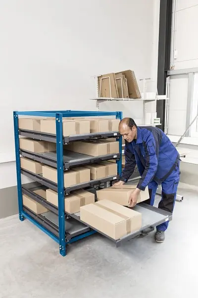 KROG Kompaktregal mit 5 Schubfächern 200 kg Traglast, 70 % Auszug, 2215000, 4004165005821Unsere Kompaktregale sind mit 3 bis 7 Schubfächern ausgestattet wobei jedes Schubfach eine Traglast von 200 kg bei einer Auszugstiefe von 70% aufweist. Die Auflagefläche der Schubfächer entsprechen den EURO-Maße von 800 x 1.200 mm und können somit optimal zur Einlagerung von genormten Euro-Behältern bzw. KLT-Behältern genutzt werden. An den Seiten sorgen Ränder dafür, dass die Behälter einen gewissen Hantik haben und nicht verrutschen. Der durchgehende Stahlboden in Verbindung mit der seitlichen Umrandung bietet Ihnen ebenfalls die Möglichkeit zur direkten Einlagerung von Waren und Kleinteilen auf den Schubfächern.Technische Daten:
