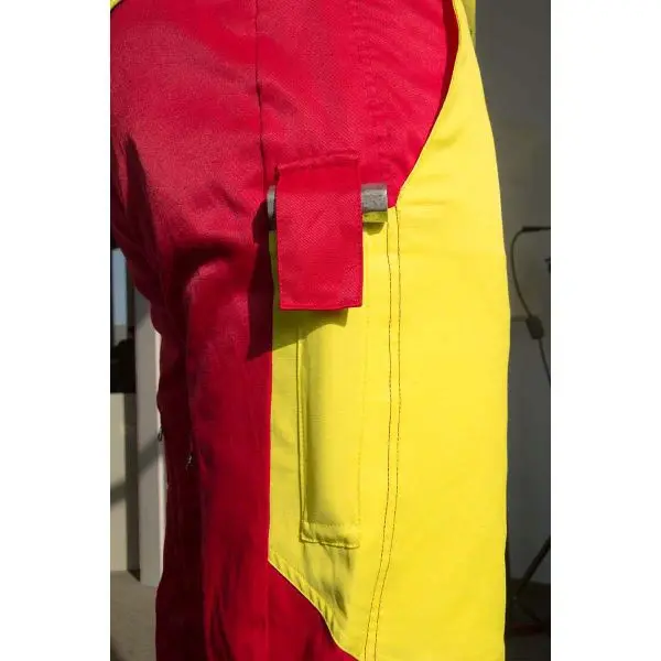 L+D Forstschutz-Hose Bequemlichkeit, Schnittschutzeinlage (6 lagig) Reflexapplikationen, frische Farbkombination neongelb/rot, Grösse: 56, 4117-56, 4007581411757innovative Forstschutzbundhose aus Polyester-Baumwollgemisch, mit abnehmbaren, strapazierfähigen Hosenträgern, frische Farbkombination rot/neongelb, angenehmer und einfacher Tragekomfort durch die frischartige 6-lagige Schnittschutzeinlage, Elastikeinsatz zwischen den Beinen, Bund mit Klett weitenregulierbar, Gürtelweisefen, hochgezogener Nierenbereich, robuste Verstärkungen auf den Knien, Belüftungsöffnungen auf der Oberschenkelrückseite mit Reißverschluss verschließbar, schmale Reflexpipings an der Vorder- und Rückseite, Befestigungshaken für Schnürstiefel am Beinende, 2 Seitentaschen, 2 Gesäßtaschen, 1 Kettensägenschlüsseltasche sowie eine winzigere Beintasche, KWF-geprüft.Technische Daten: