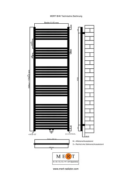 MERT Austauschheizkörper weiß, lineare, 600 x 1750 mm, Anschlussabstand an der Seite 500 mm, 1-60×175-ASR-50, 4260289851373