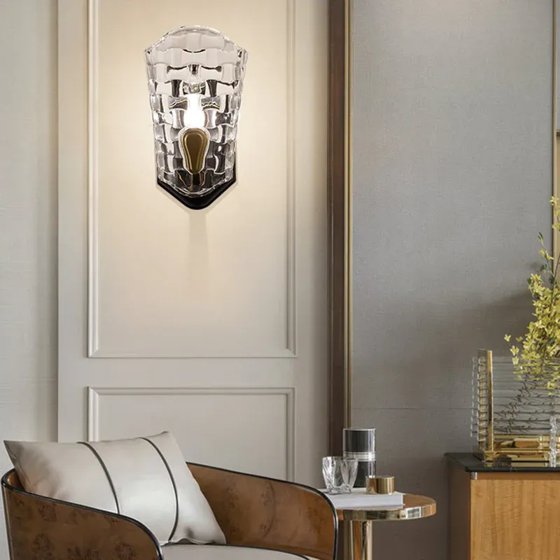 Modernistische schwarze Wandleuchte aus Metall mit gebogenem Arm, 1-flammige Wandleuchte mit klarem Kristallpanel