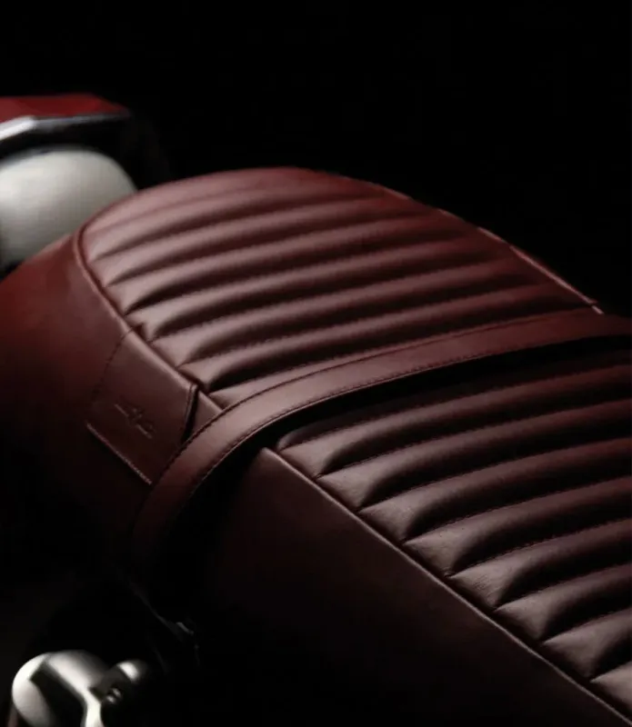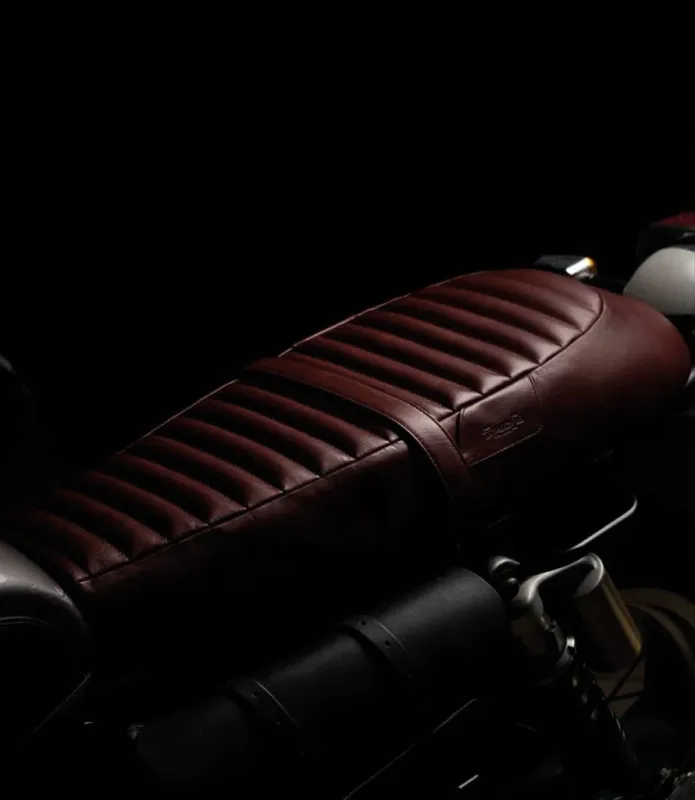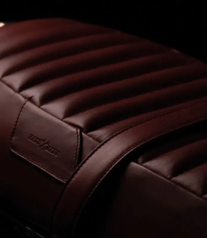 Die Motorradsitz Royal Enfield für Interceptor 650 und Continental GT 650 von Trip Machine mit schlankem Profil ist aus wasserabweisendem rotem Leder gefertigt, um den Witterungen zu widerstehen und sich mit der Nutzung Tag für Tag zu verbessern.