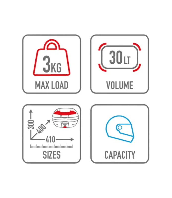 Mit einer maximalen Tragfähigkeit von 3 kg bietet der Motorradtopcase E300NT2 ausreichend Platz für persönliche Gegenstände, Regenbekleidung oder kleine Reiseaccessoires und macht ihn zu einem idealen Begleiter für den täglichen Gebrauch oder kurze Reisen.