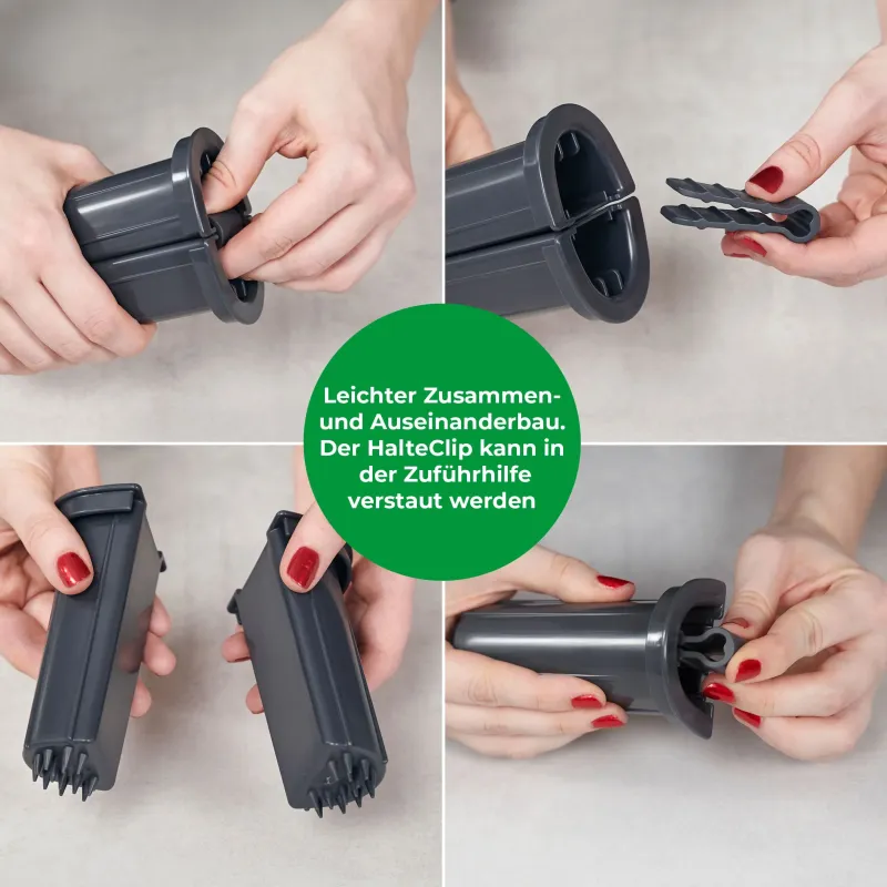 Als Erweiterung zu unserem WunderSlicer gibt es jetzt die geteilte Zuführhilfe. Damit kann der Zuführschacht in zwei Teile geteilt werden, sodass auch für kleines Schnittgut optimale Schneidergebnisse erzielt werden können. Winzige Zwiebelstückchen? Feinste Karottenraspeln? Hauchdünne Lauchscheibchen? Kein Problem mit der neuen geteilten Zuführhilfe für den WunderSlicer.
