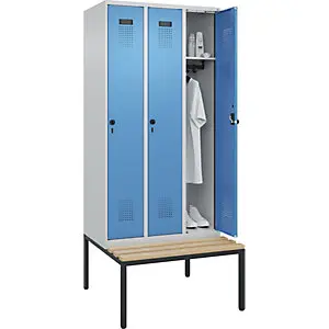 Spind Evolo PLUS Sitzbank, 3 Abteile, lichtgrau / lichtblau, B 900 mm, Sicherheits-Drehriegel, mit untergebauter Sitzbank, Buche.