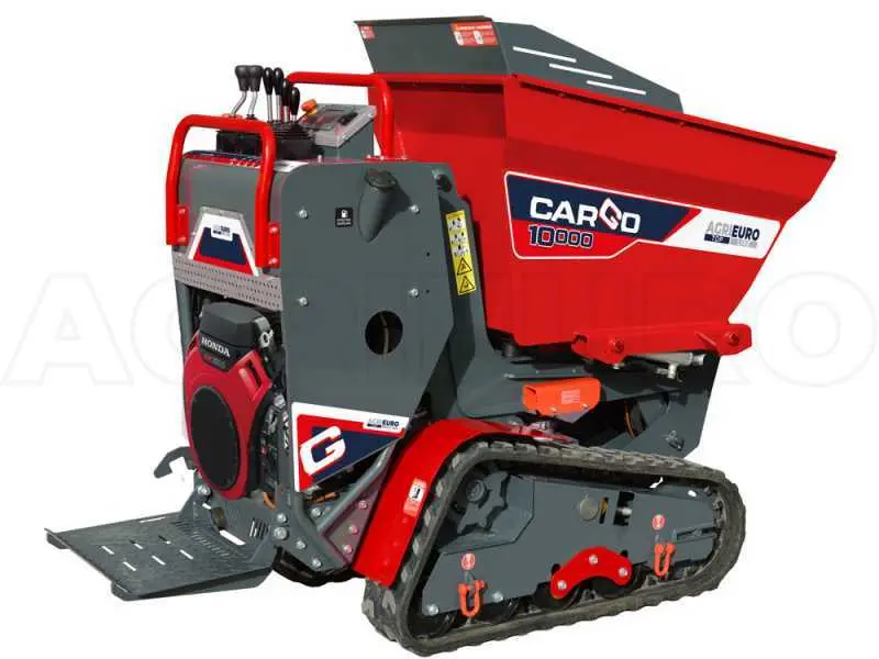 AgriEuro Top-Line CARGO L 10000 HEDT 4.0 Raupendumper ist mit einer hydraulischen Dumper-Mulde mit dreiseitiger Entladung und einem leistungsstarken Zweizylinder-Honda Gxe630 Motor mit Elektrostarter ausgestattet. Der Motor hat eine Nennleistung von 20,8 PS.