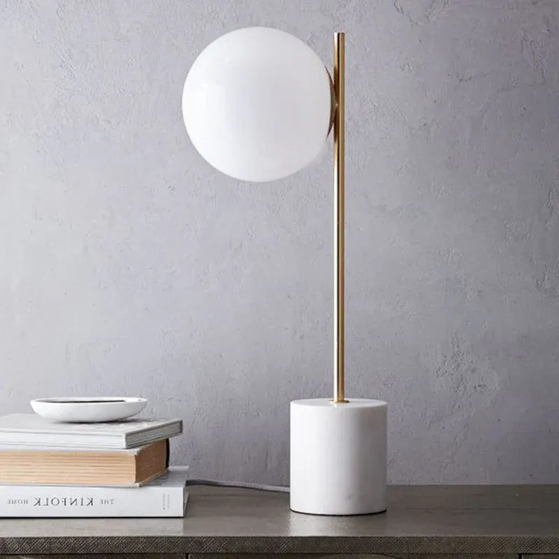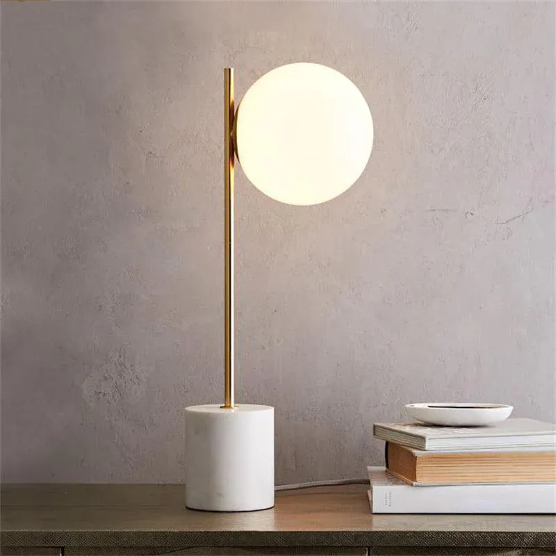 Weiße, kugelförmige Tischlampe aus Glas, moderne 1-Kopf-Lesebuchleuchte mit Marmorsockel