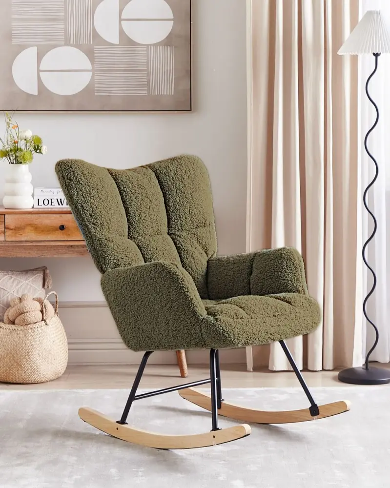 Modern Biscuit Tufting Rocking Chair Create a cosy nook, where you’ll be able to relax and unwind with this rocking chair. The piece features boucle upholstery, which is tufted in a trendy biscuit style. Placed on rubber wood skates, the chair offers smooth rocking function, which makes it a great addition to a living room or bedroom, as well as children’s room – sit on it with your kid and watch them fall asleep in an inst