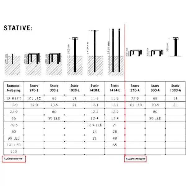 ScanProGestaltung Stativ 1400 E Einbetonieren, 99140, 7330589991400Safepost 1400-E Stativ zum Einbetonieren – Universal Briefkasten Stativ für Lochabstand von 50 – 230 mmUniversal Briefkasten Stativ für Lochabstand von 50 – 230 mm geeignet für Safepost 11-9, 12-2,12-3, 12-4, 14, 15, 21, 28, 50, 762, 764, 765Montageart: zum Einbetonieren. Standfuß Höhe: 1400 mm (2x Standfüße mit jeweils 700 mm Höhe zum verschrauben ergeben die Gesamthöhe 1400 mm). Breite Blechverbindung: 265 mm (zum Anschrauben des Briefkastens). Farbe: schwarz lackiert verzinktTechnische Daten: