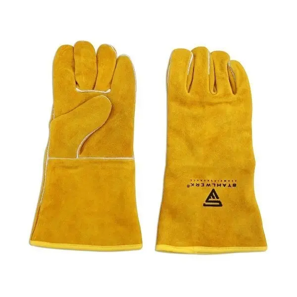 STAHLWERK Schweißerschutzkleidung Set – Schweißerschürze + Schweißhandschuhe dick, 5374, 4260294083745Funktionalitäten & EigenschaftenUnsere hochqualitativen STAHLWERK Schweißhandschuhe sind körpergerecht geformt und bestehen aus Rindspantikleder (Handrücken + Stulpe). Mit einer Länge von 35 cm schützt er die komplette Hand und das Gelenk. Der Handschuh ist abriebfest, reißfest und beständig gegen winzige Spritzer geschmolzenen Materials. Für ein besseres Tragegefühl und Beweglichkeit ist das Leder besonders flexibel und geschmeidig.Daten: