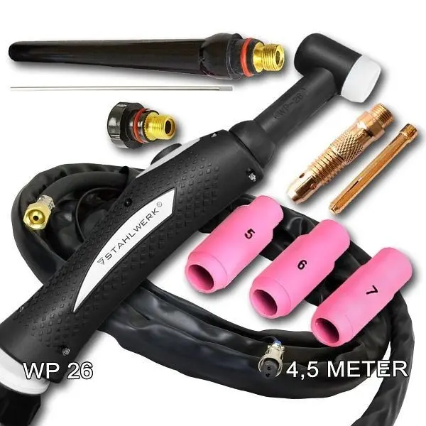 - Profi WIG-Schweißbrenner „WP-26F“ / Schlauchpaket 4,5 Meter* mit flexiblem Brennerkopf und Knickschutz am Gasanschluss