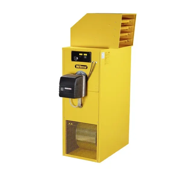 Wilms Werkstatt-Lufterhitzer mit Abgasführung WLE 75, 1260075, 4027755600756Der WILMS Lufterhitzer WLE 75 ist ohne aufwendige Installation einsatzbereit. Entweder leicht aufstellen, oder auf eine Wandkonsole (Sonderzubehör) montieren, Kamin anschließen und Brennstoffschläuche in den Öltank (Sonderzubehör) stecken.Gerätestecker in eine 230 V – Steckdose einstecken, einschantiken und sofort heizen.Der Warmluftstrom kann durch die um 360° drehbare Ausblashaube mit den Luftführungslamellen gezielt geleitet werden.Der Heizer ist komplett ausgerüstet mit einem Ölbrenner, Ölfilter, Ansaug- und Rücklaufleitung sowie einem Thermostat.